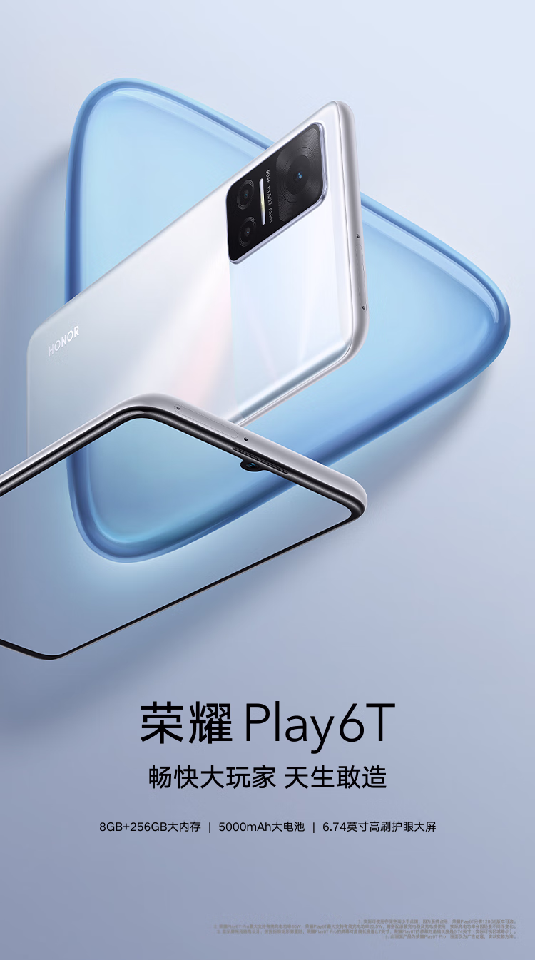 荣耀Play6T 6.74英寸高刷护眼屏 侧边指纹解锁 5000mAh大电池 全网通 5G手机 8GB+128GB 钛空银
