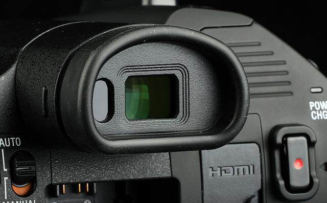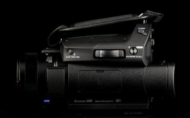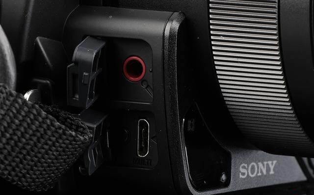 机身本体左侧是内置麦克风,中部是索尼的多接口卡座,二期上方从左到右分别是ASSIGN5按钮/IRIS PUSH AUTO按钮、电动变焦控制杆和ASSIGN4按钮/FOCUS MAGNIFIER按钮/PHOTO按钮(仅限照片模式)。