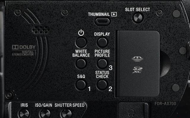 打开显示屏后我们可以看到索尼FDR-AX700的内部控制区,这里同样有很多参数快捷按钮,它们分别是电源开关、白平衡按钮、快慢动作/ASSIGN1按钮、回放按钮、显示按钮、照片设置/ ASSIGN3按钮、状态检测/ ASSIGN2按钮和存储卡选择按钮。同时,内置扬声器和双SD卡槽也放置在了这里。