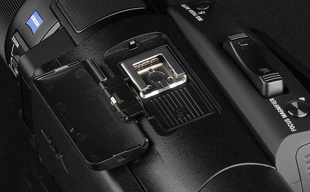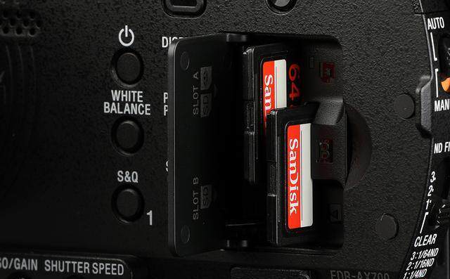 索尼FDR-AX700提供了两个存储卡卡槽,一个适用于SD卡,一个适用于SD/Memory Stick 用于视频备份或延长视频拍摄时间。卡槽上方还设置了方便切换存储卡槽的按钮。
