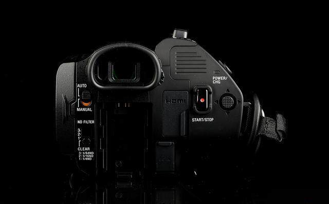 FDR-AX700背面的按钮也非常多,左侧一列有自动模式和手动模式的切换开关,其下方是内置ND滤镜的控制开关,用于调节进光亮,根据不同拍摄条件需要,提供三档选择(1/4,1/16,1/64)。中间上方是电子取景器,下方是电池仓,电池仓边上有两个隐藏的接口(HDMI输出接口和电源接口)。最右边的则是拍摄按钮、五维控制杆以及电源指示灯。