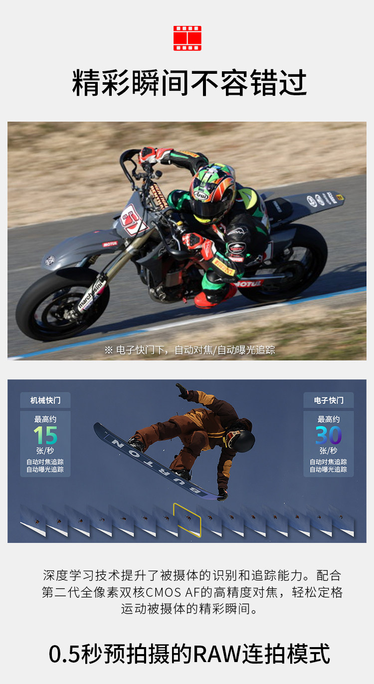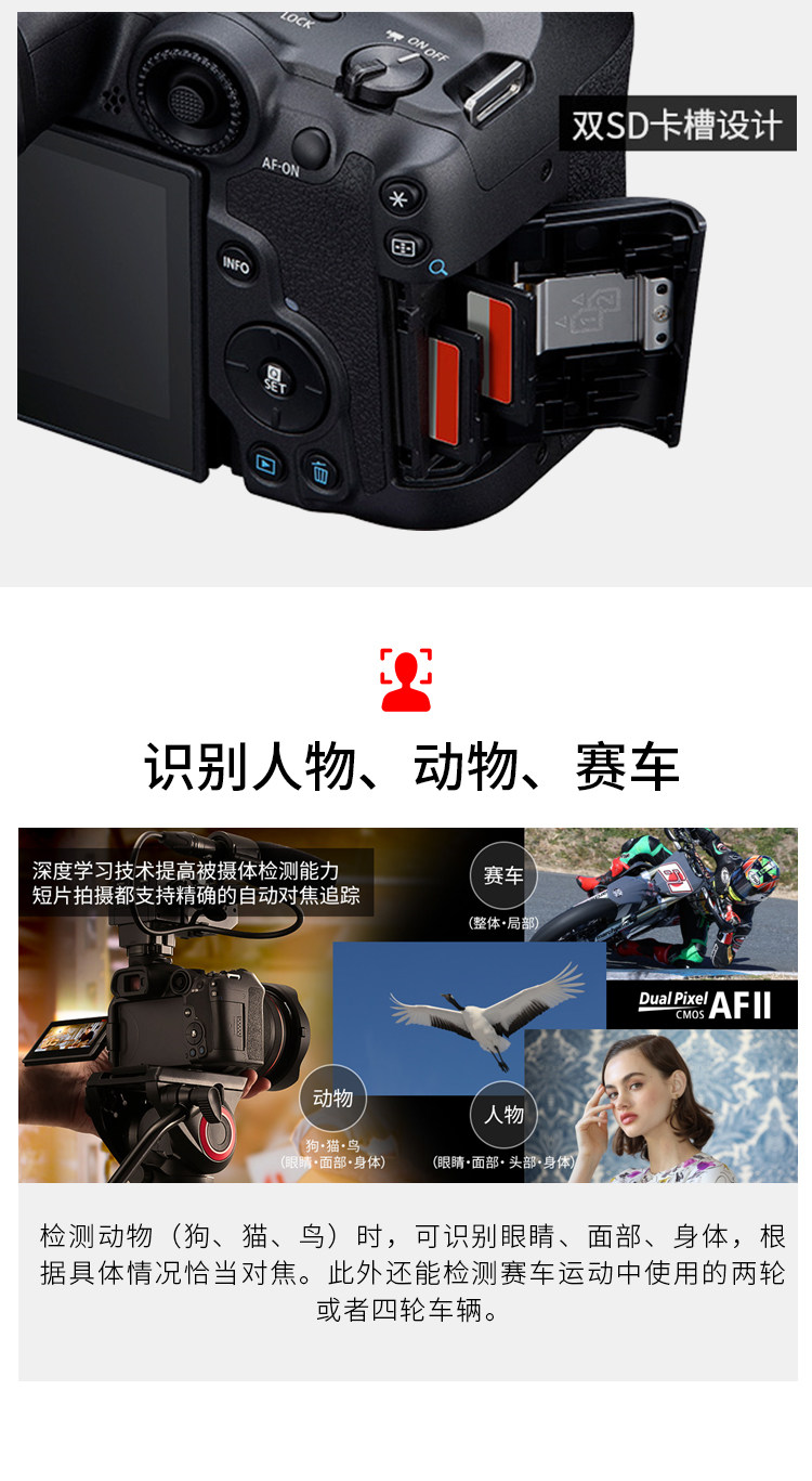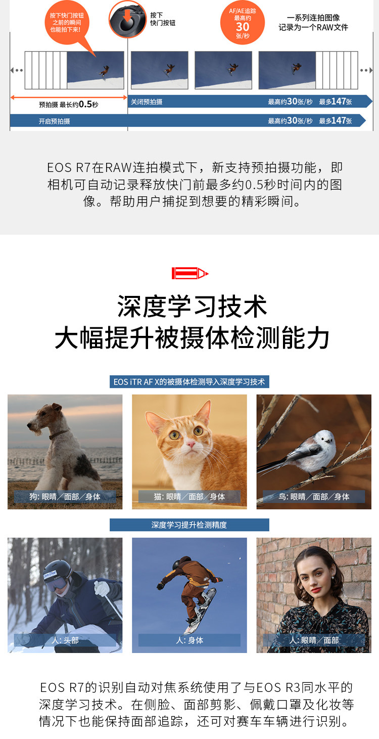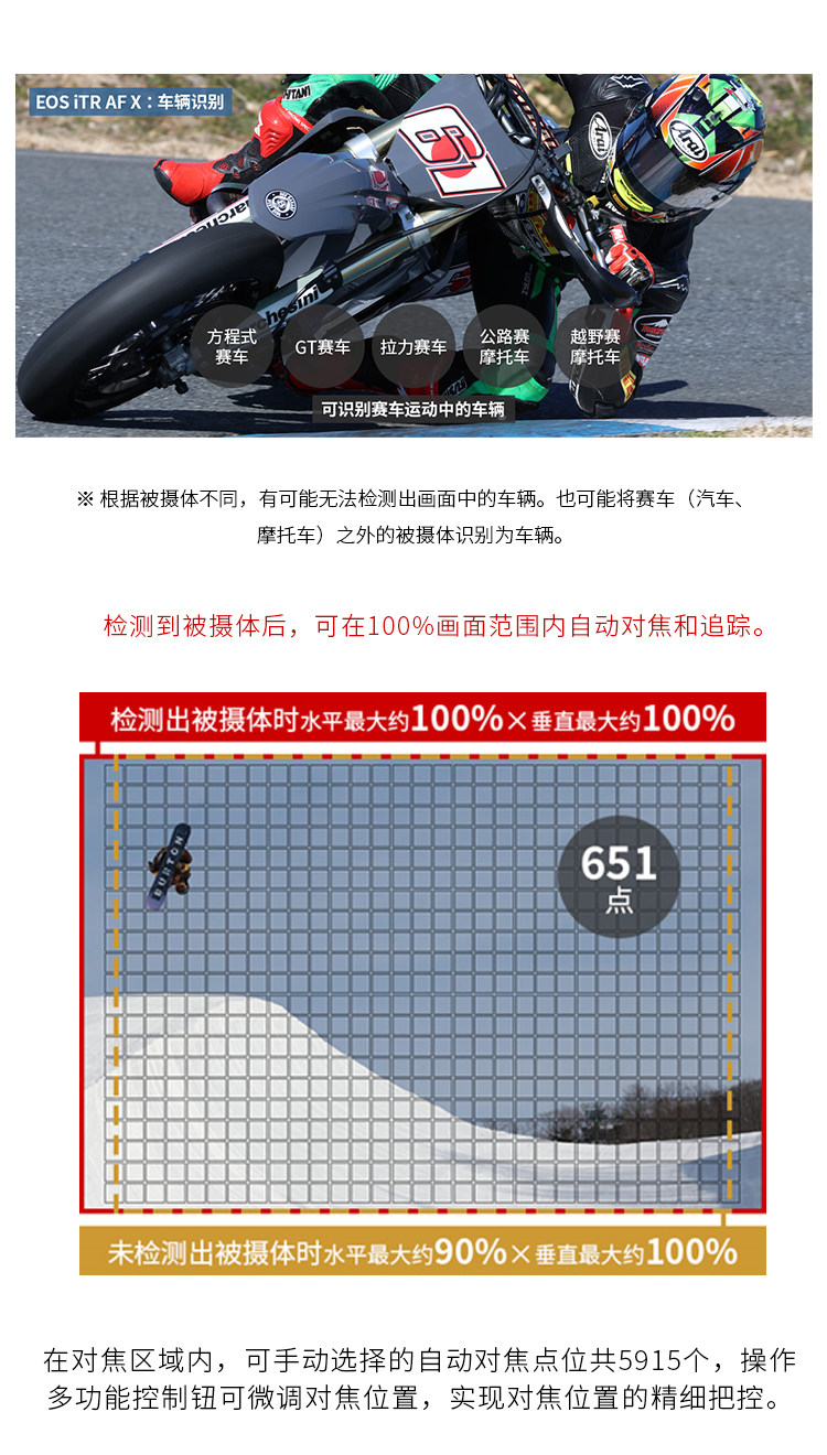 检测动物 (狗、猫、鸟) 时,可识别眼睛、面部、身体,根据具体情况恰当对焦。此外还能检测赛车运动中使用的两轮或者四轮车辆。