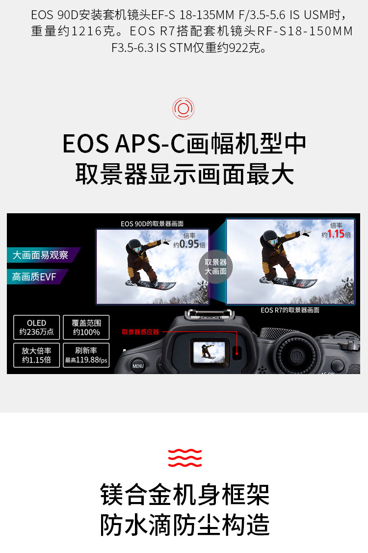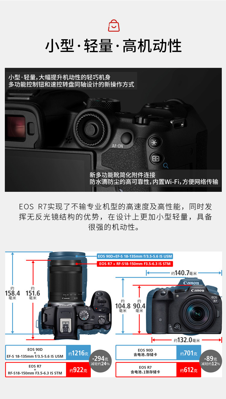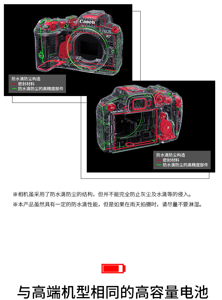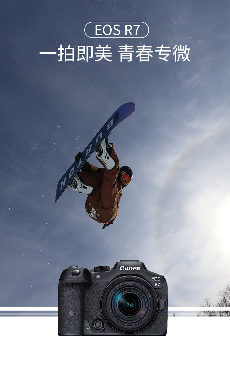 EOS R7实现了不输专业机型的高速度及高性能,同时发挥无反光镜结构的优势,在设计上更加小型轻量,具备很强的机动性。