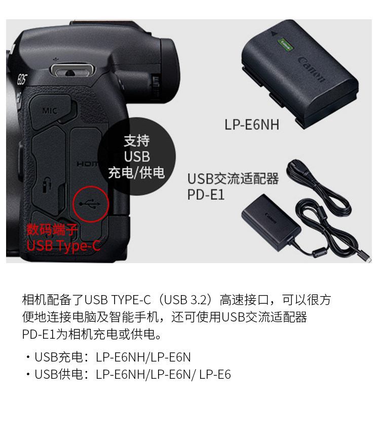 ·USB供电: LP-E6NH/LP-E6N/LP-E6