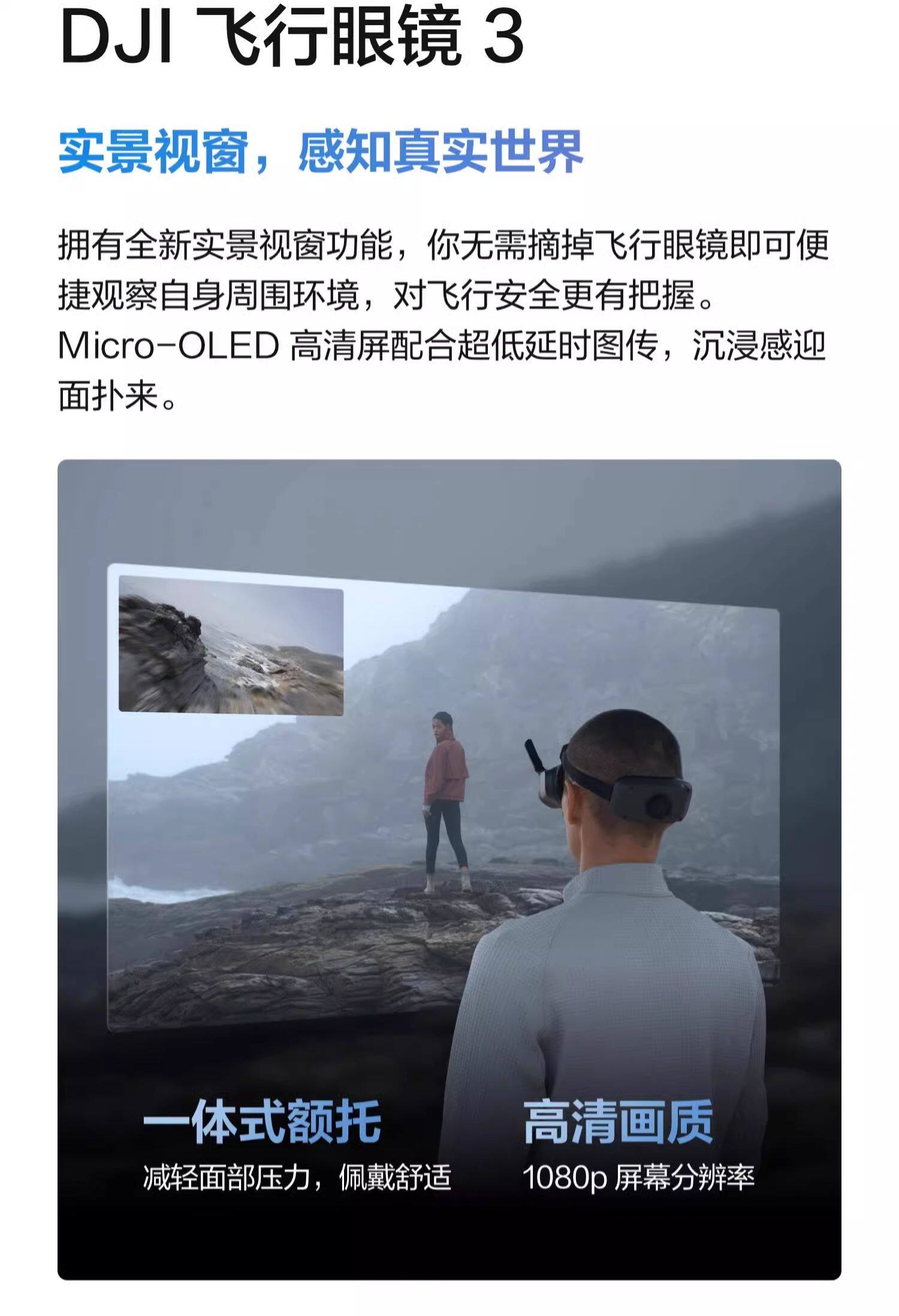 拥有全新实景视窗功能,你无需摘掉飞行眼镜即可便捷观察自身周围环境,对飞行安全更有把握。Micro-OLED 高清屏配合超低延时图传,沉浸感迎面扑来。