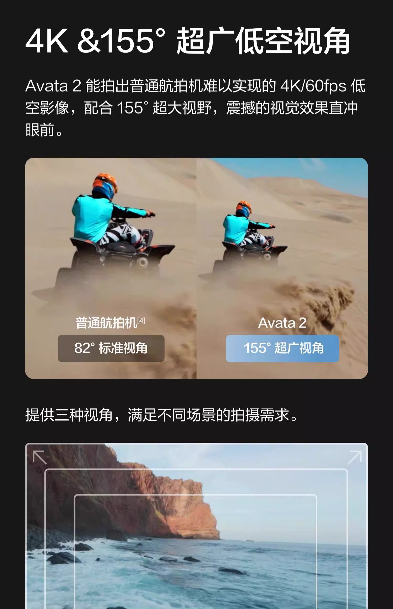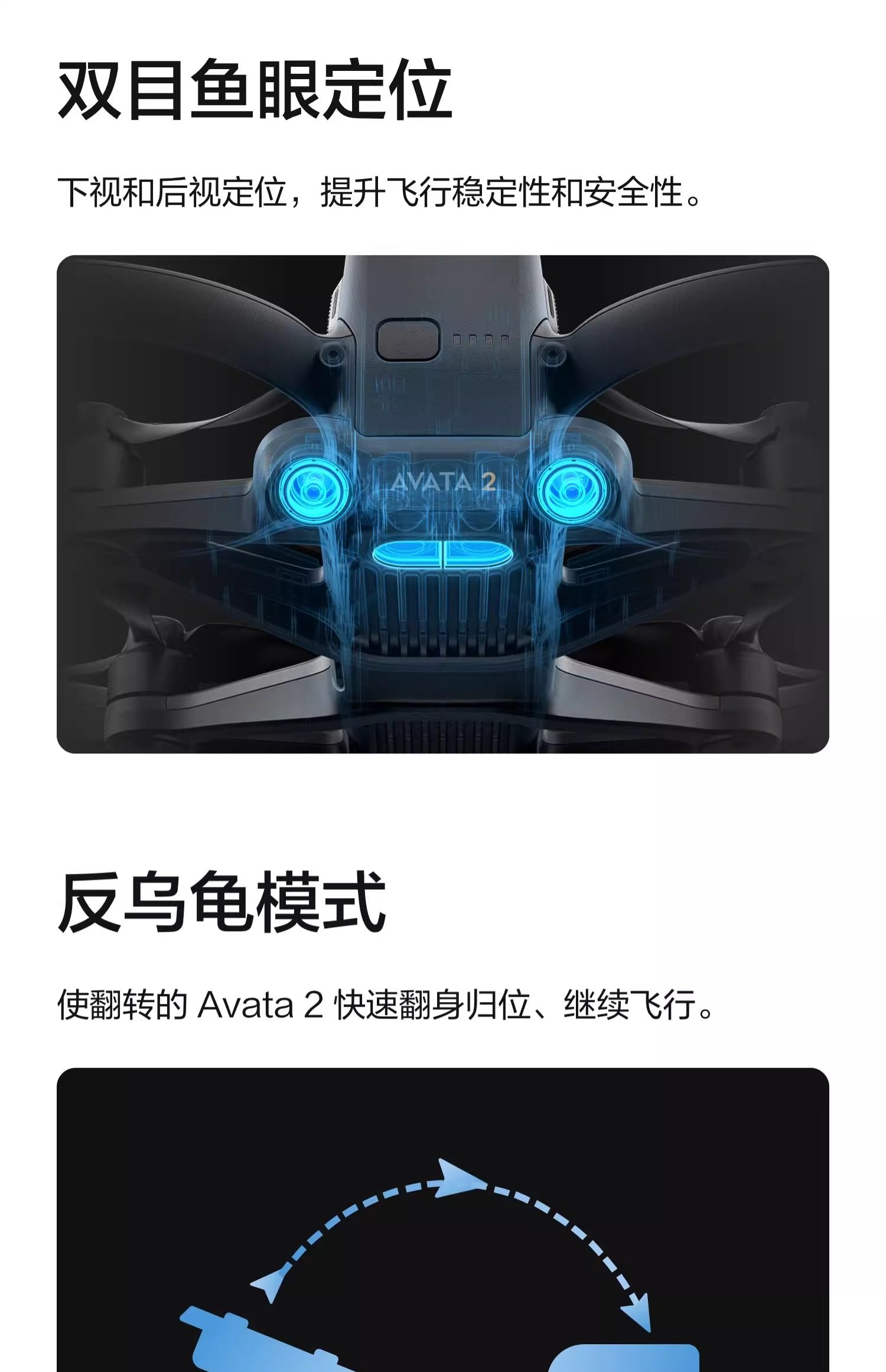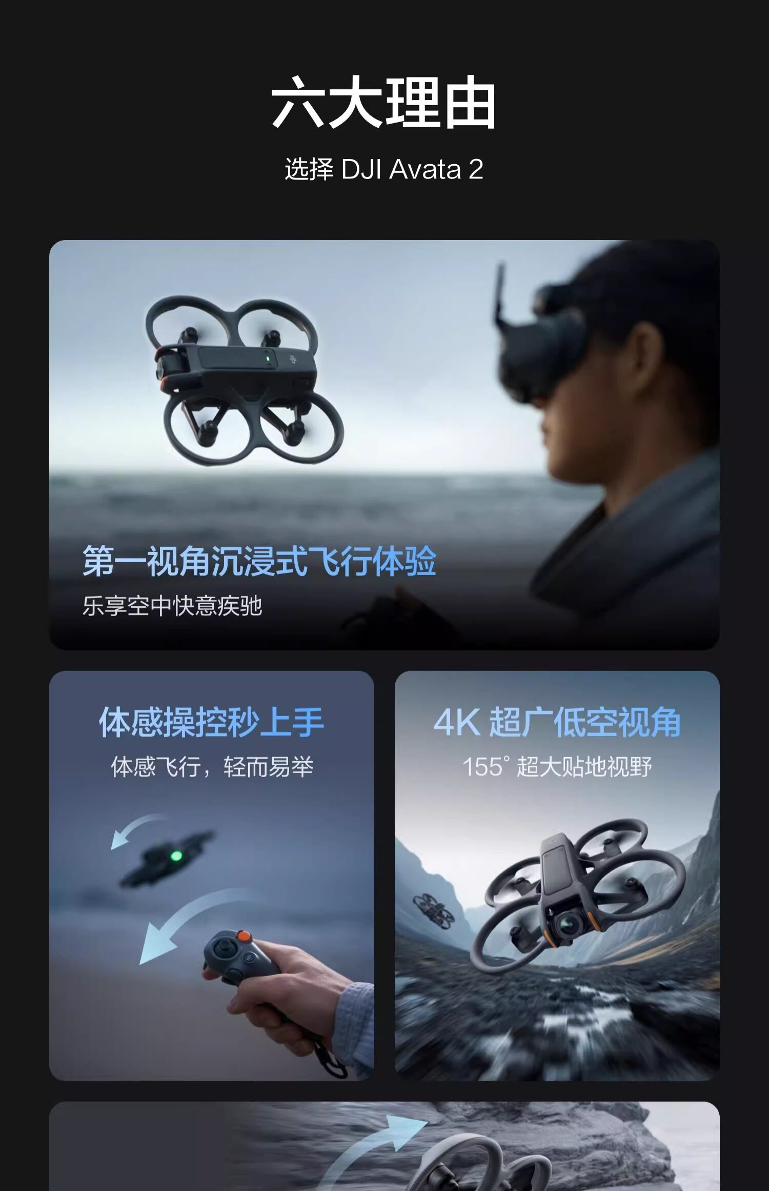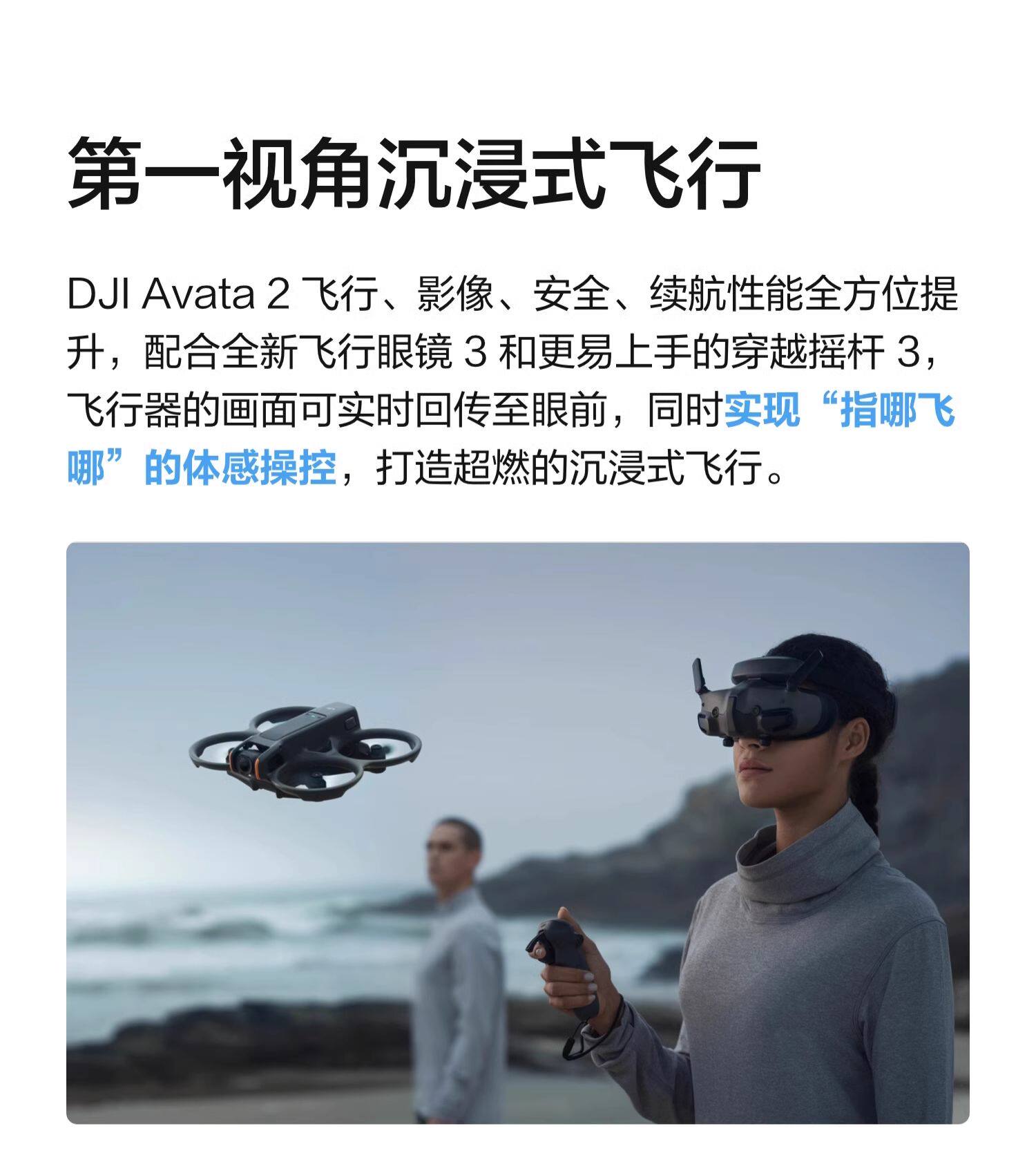 DJI Avata 2 飞行、影像、安全、续航性能全方位提升,配合全新飞行眼镜 3 和更易上手的穿越摇杆 3,飞行器的画面可实时回传至眼前,同时实现“指哪飞哪”的体感操控,打造超燃的沉浸式飞行。