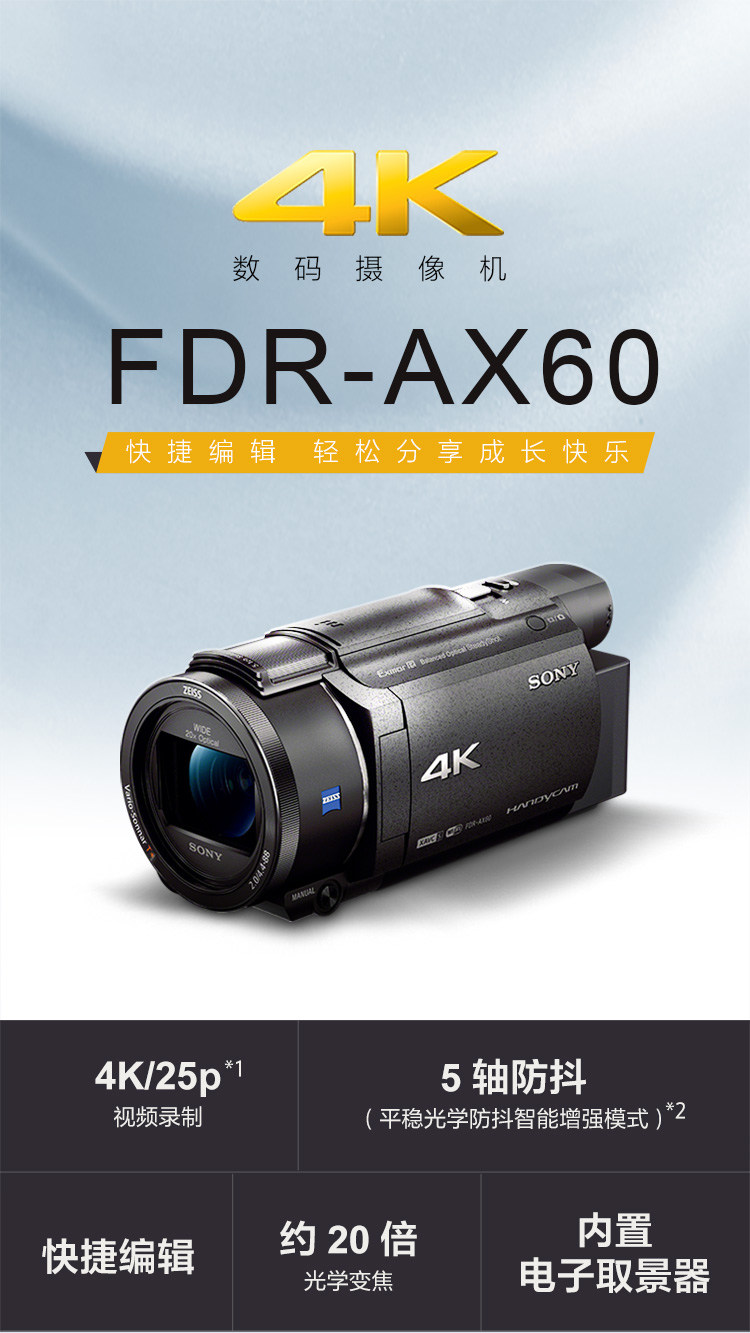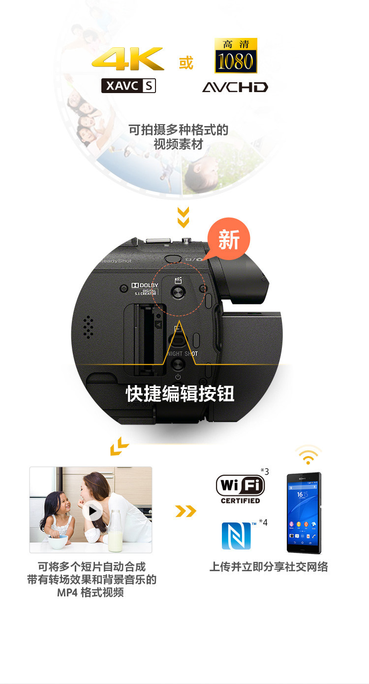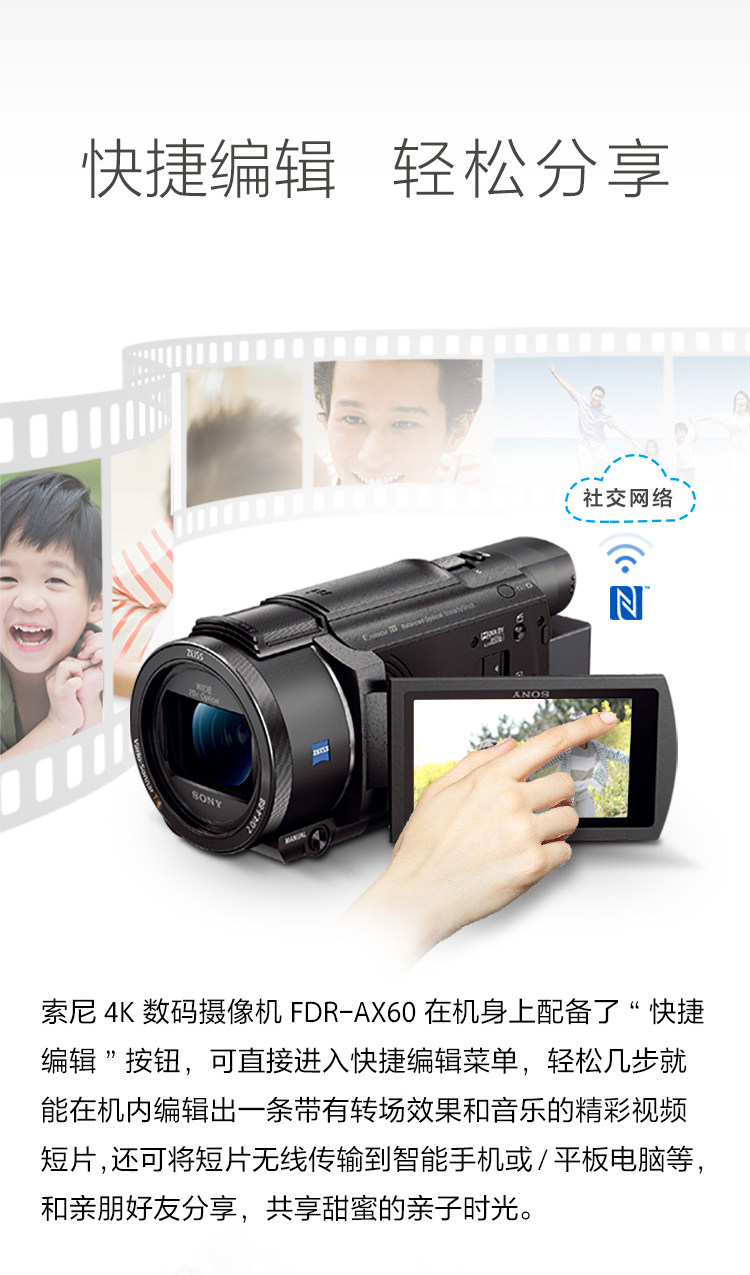 索尼 4K 数码摄像机 FDR-AX60 在机身上配备了“快捷编辑”按钮,可直接进入快捷编辑菜单,轻松几步就能在机内编辑出一条带有转场效果和音乐的精彩视频短片,还可将短片无线传输到智能手机或/平板电脑等和亲朋好友分享,共享甜蜜的亲子时光。