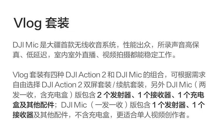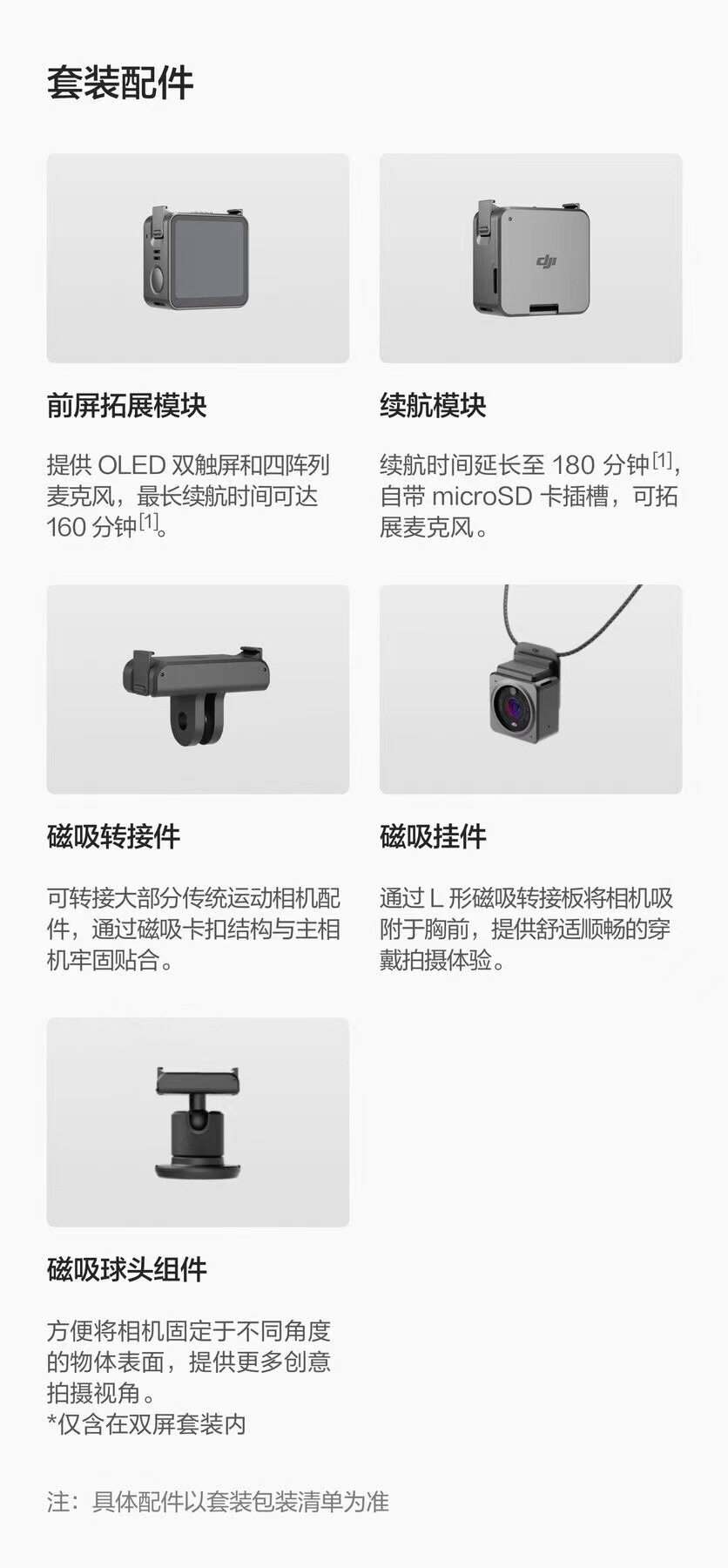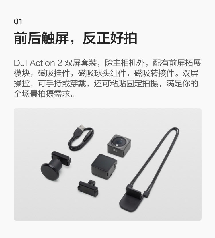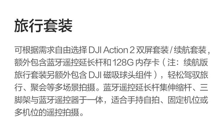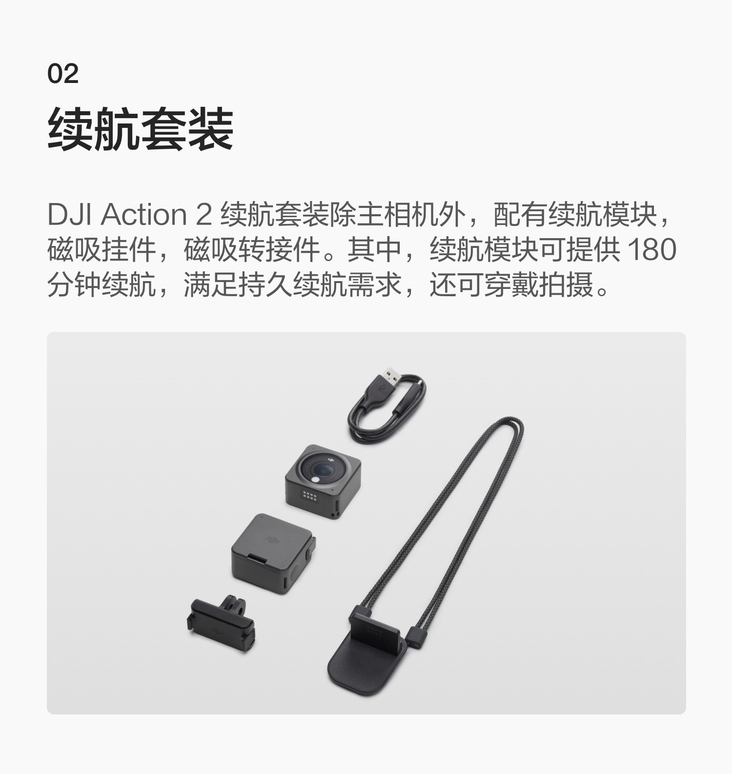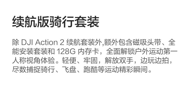 除 DJI Action 2 续航套装外,额外包含磁吸头带、全能安装套装和 128G 内存卡,全面解锁户外运动第人称视角体验。轻便、牢固,解放双手,边玩边拍尽数捕捉骑行、飞盘、跑酷等运动精彩瞬间。