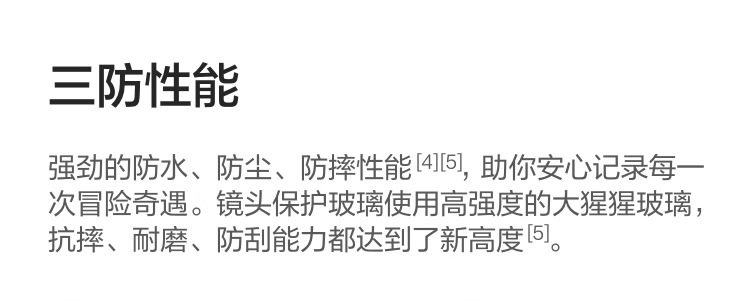 牢固密封的机身,主相机10 米[4]防水,还有强劲的防尘、防摔性能。镜头耐磨防刮,轻松搞定各类复杂拍摄场景。