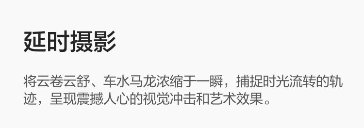 数码变焦、延时摄影、慢动作等绝技,都不在话下,拍完后还可自动为你挑选和剪辑精华片段,配乐与转场也统统搞定。
