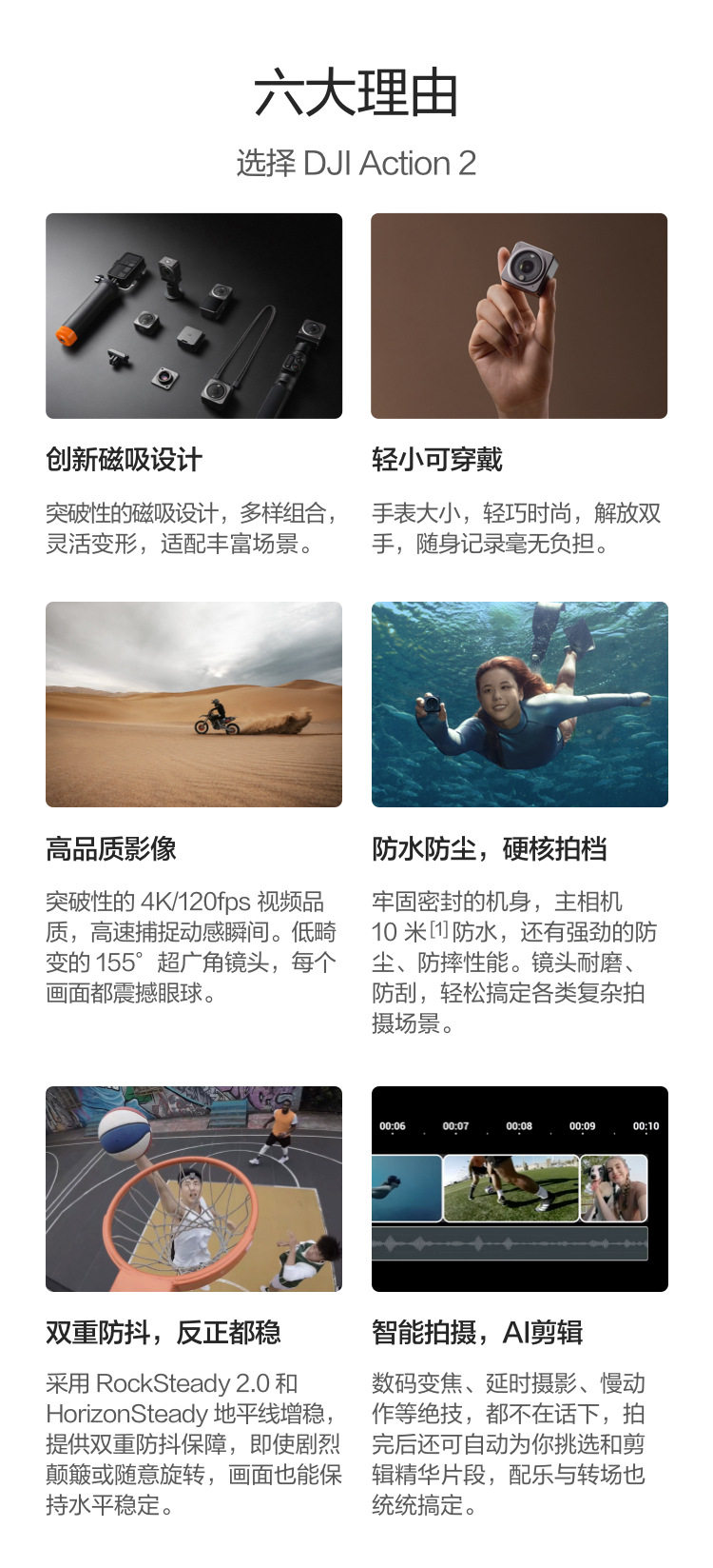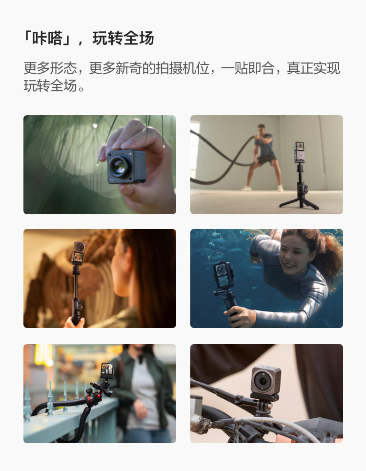 创新设计、旗舰性能。DJI Action 2 提供多形态磁吸拓展选项,适配多样拍摄场景。无论是骑行、潜水等户外运动,还是聚会、旅行等惬意日常,都能轻松驾驭。