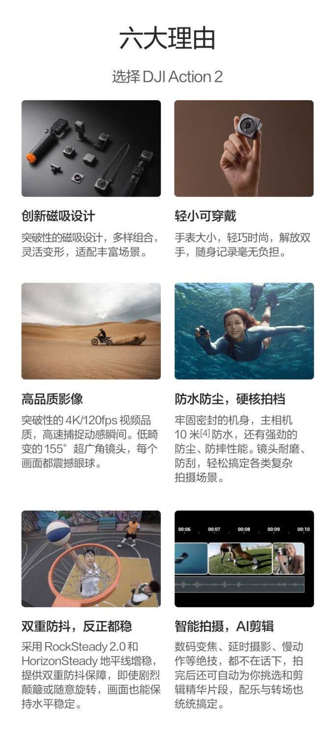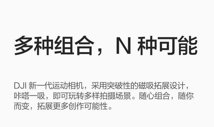 DJI 新一代运动相机,采用突破性的磁吸拓展设计,咔嗒一吸,即可玩转多样拍摄场景。随心组合,随你而变,拓展更多创作可能性。