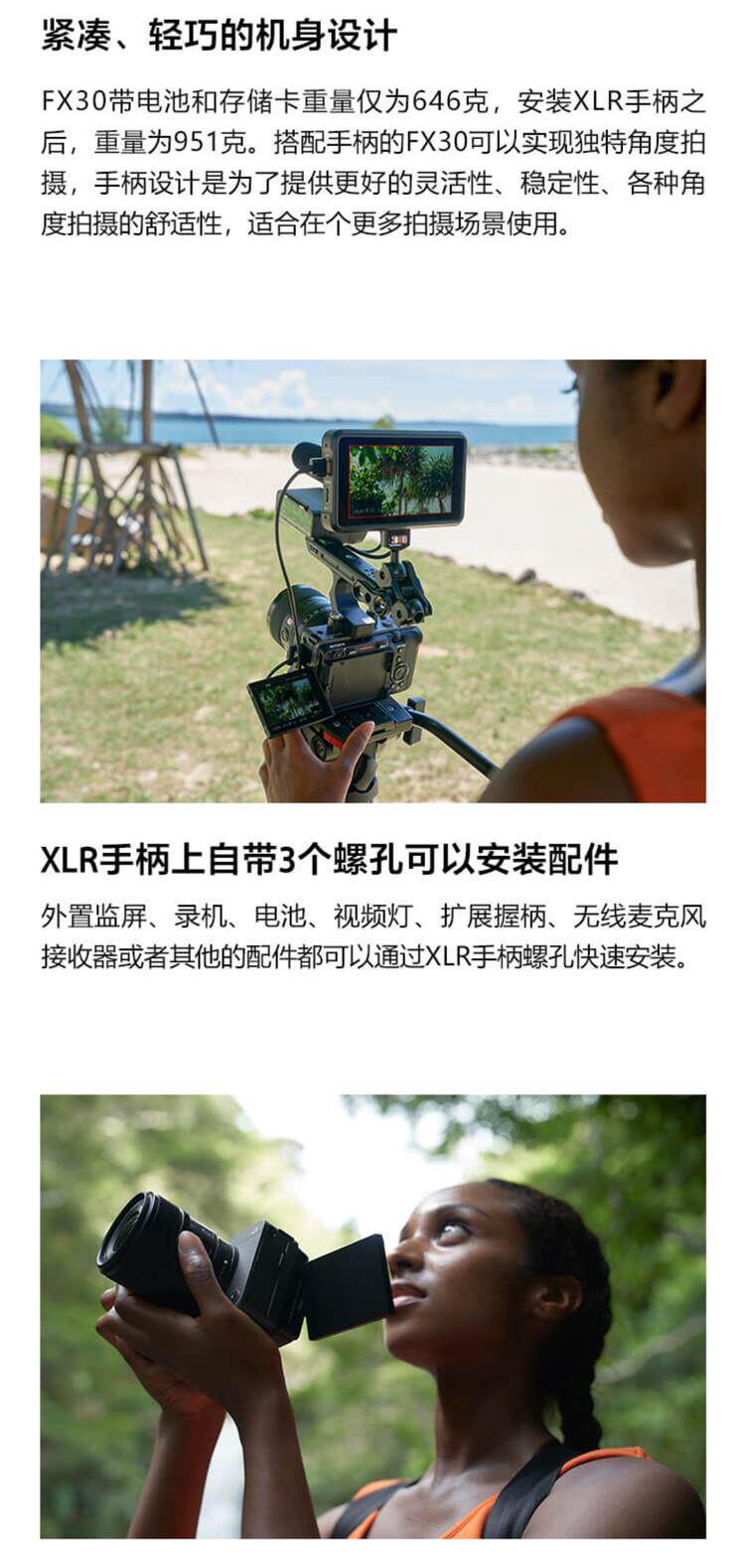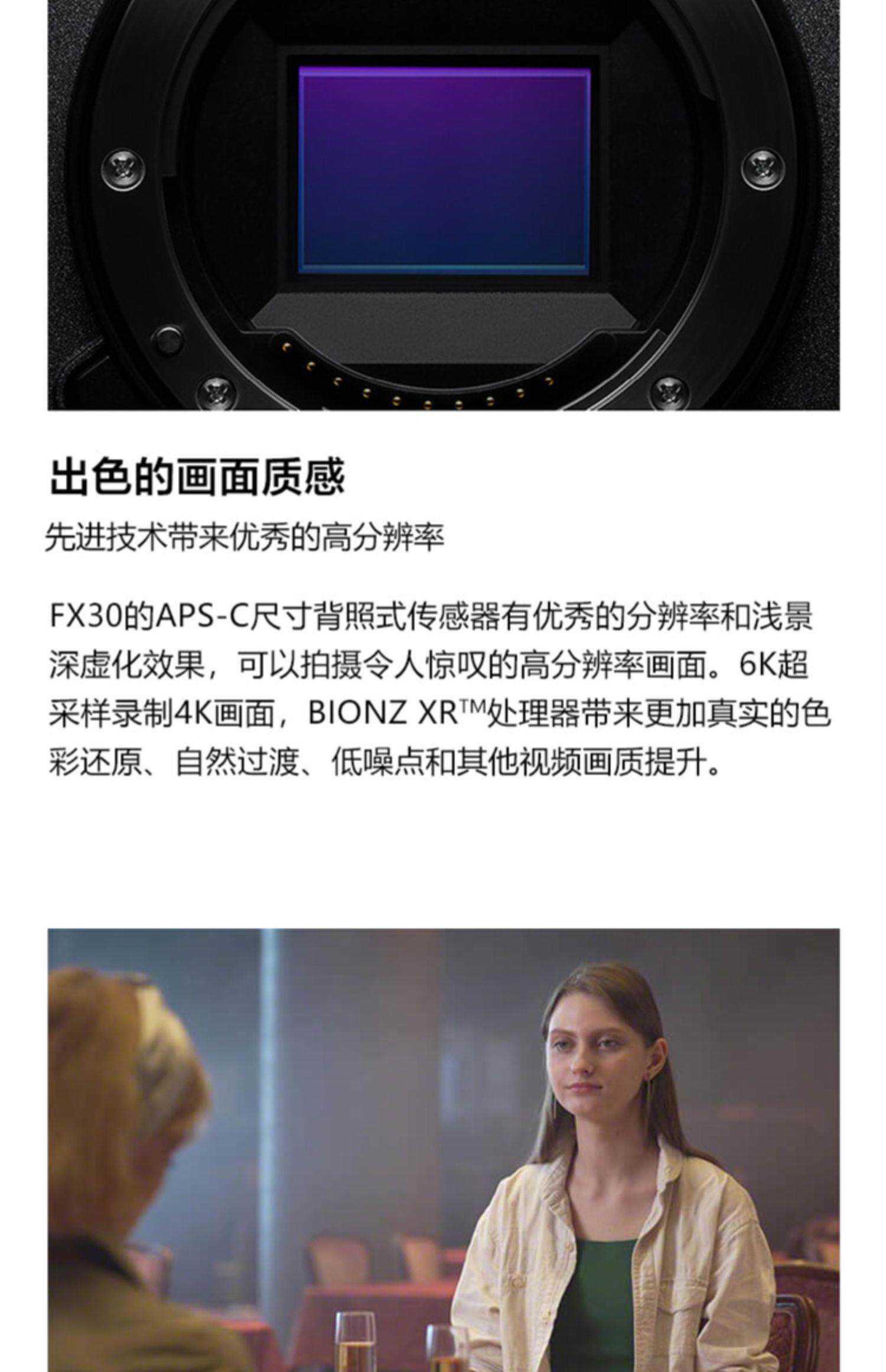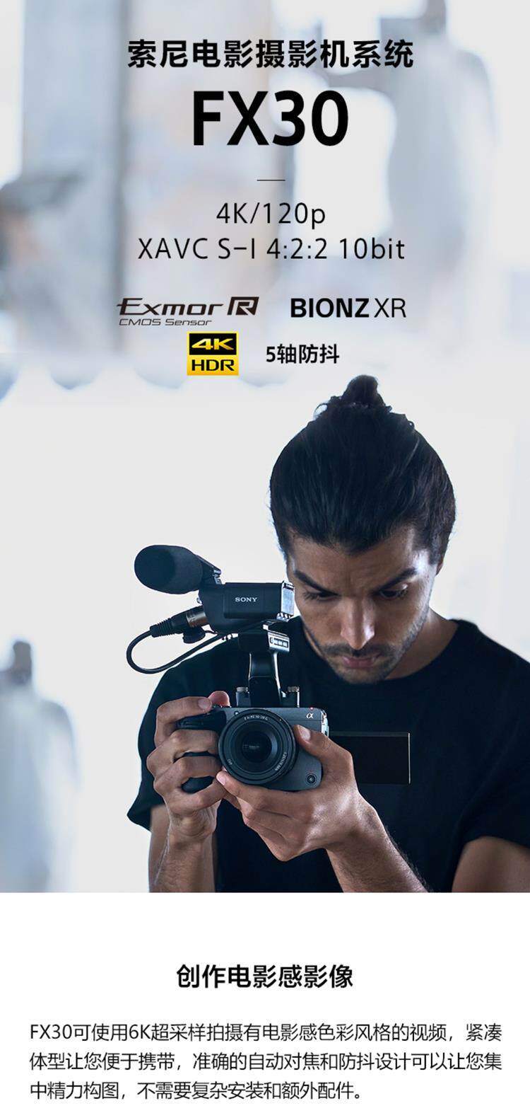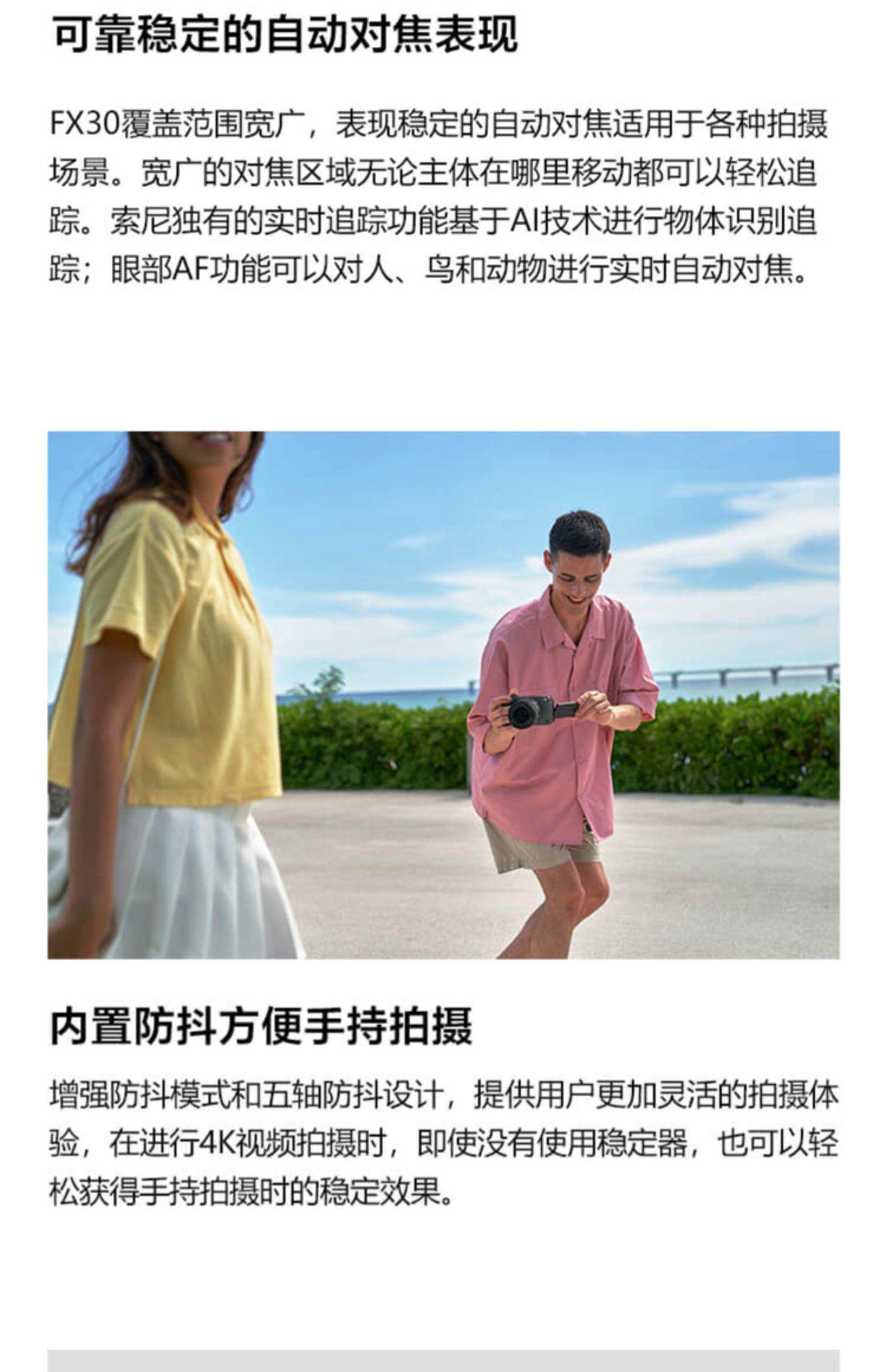 FX30可使用6K超采样拍摄有电影感色彩风格的视频,紧凑体型让您便于携带,准确的自动对焦和防抖设计可以让您集中精力构图,不需要复杂安装和额外配件。