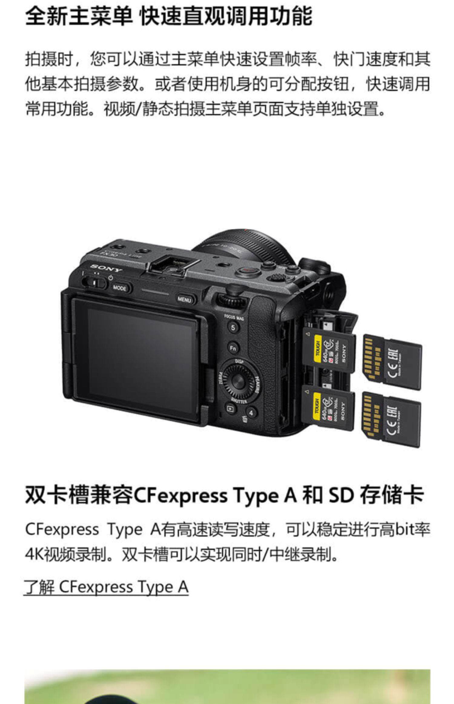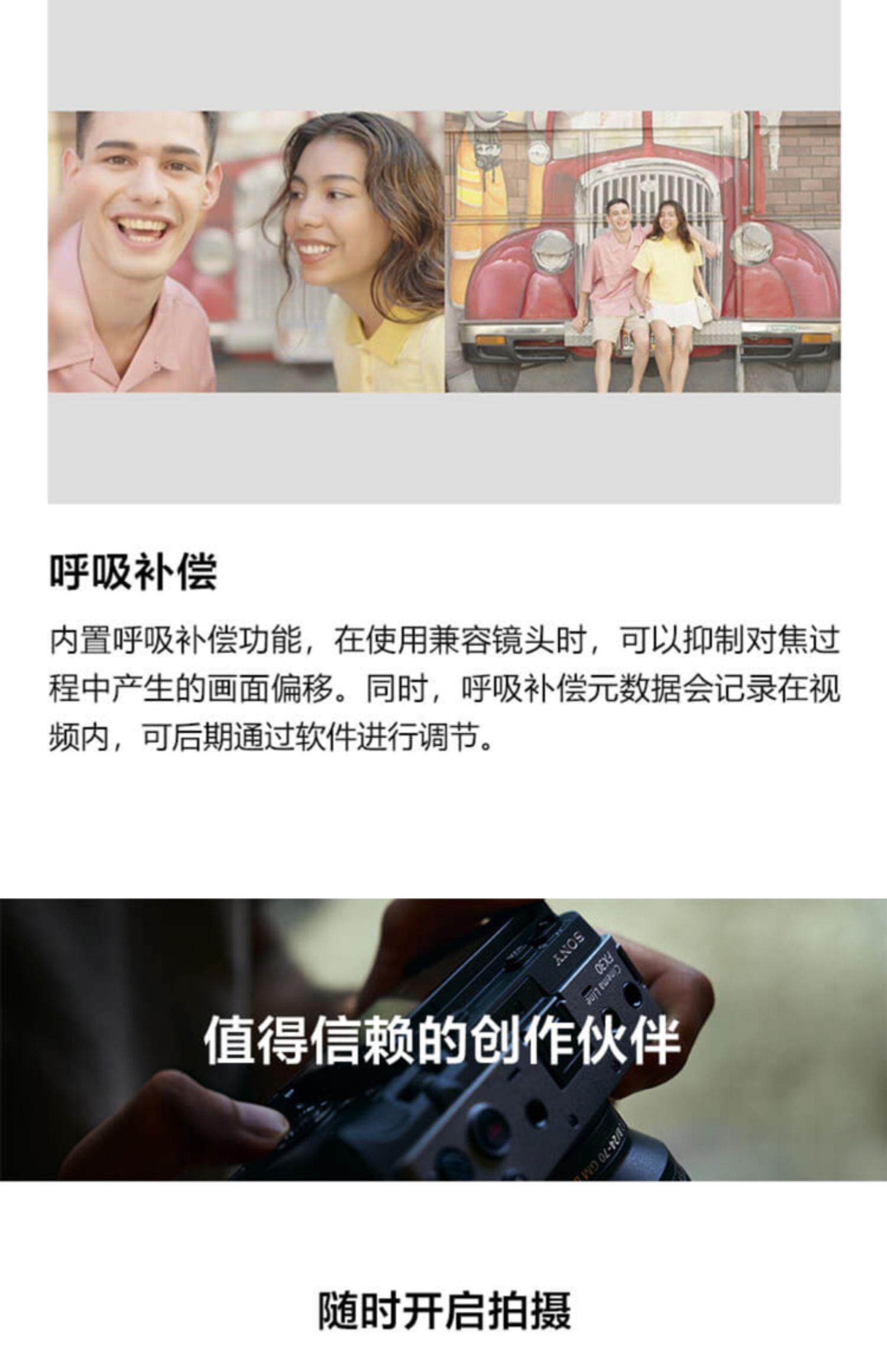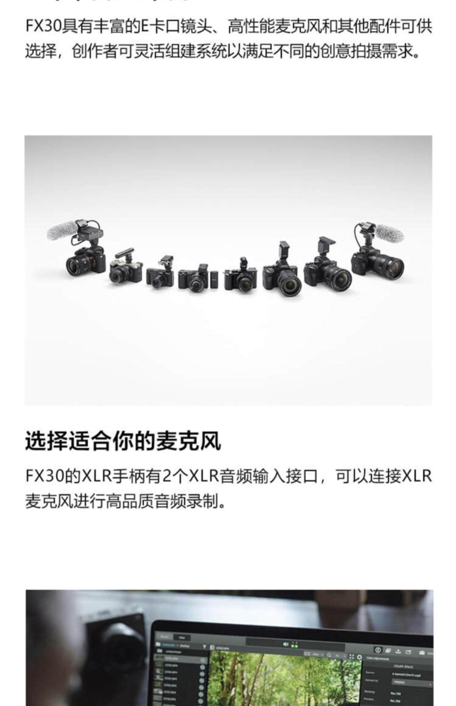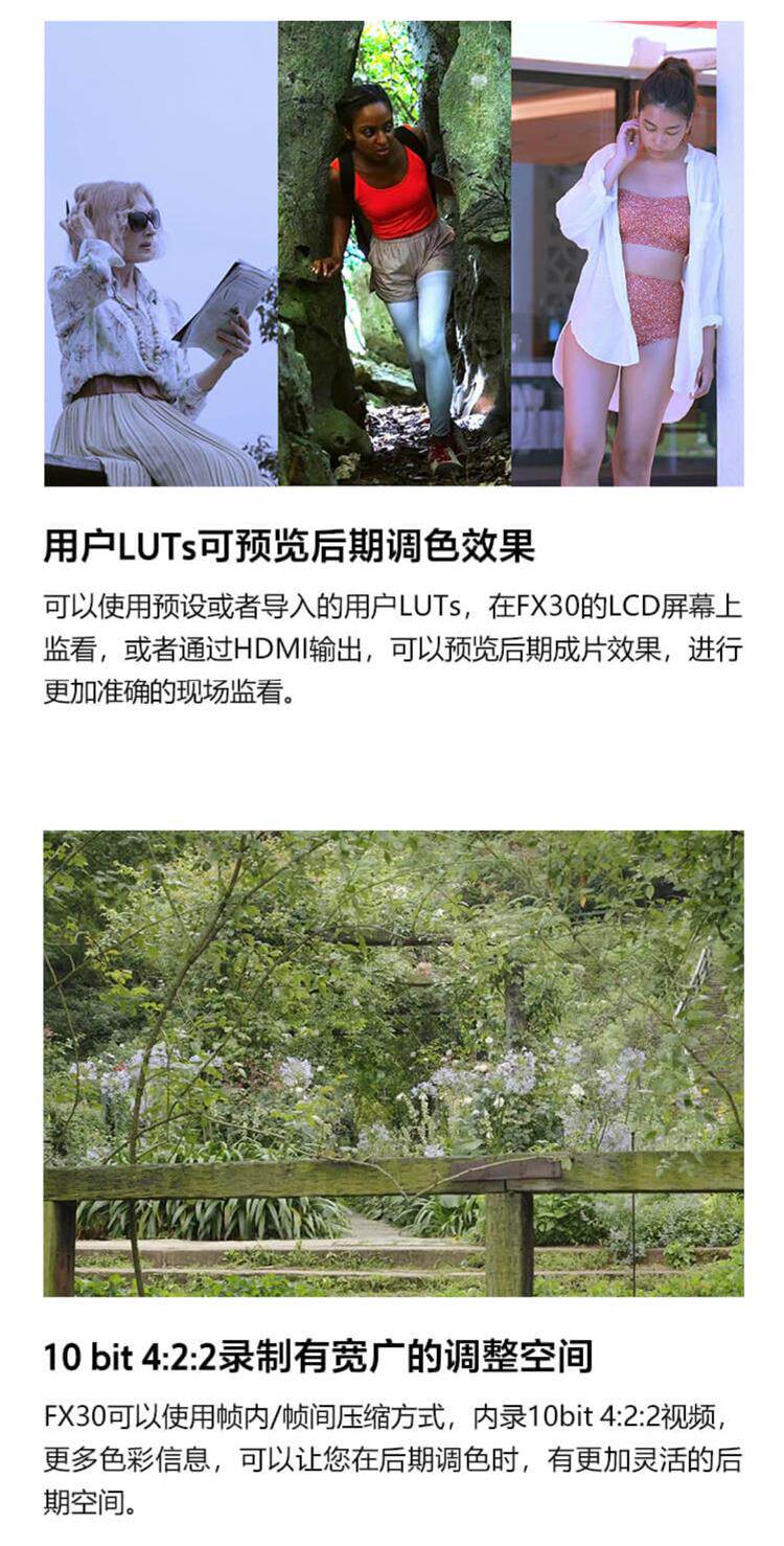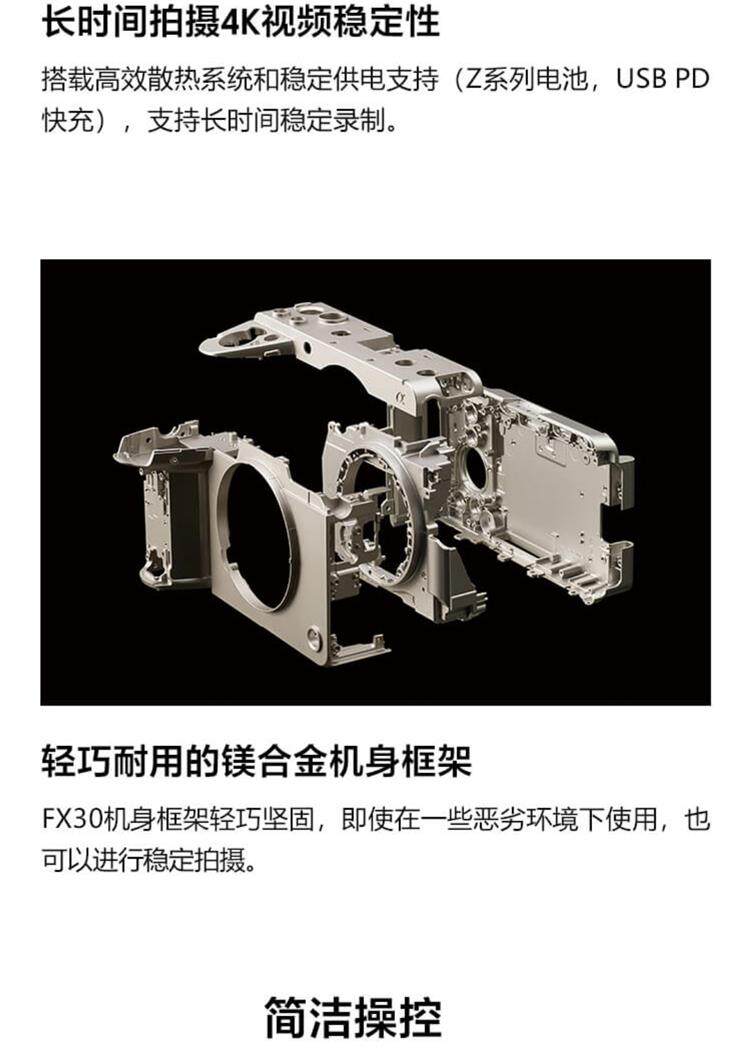 FX30可使用6K超采样拍摄有电影感色彩风格的视频,紧凑体型让您便于携带,准确的自动对焦和防抖设计可以让您集中精力构图,不需要复杂安装和额外配件。