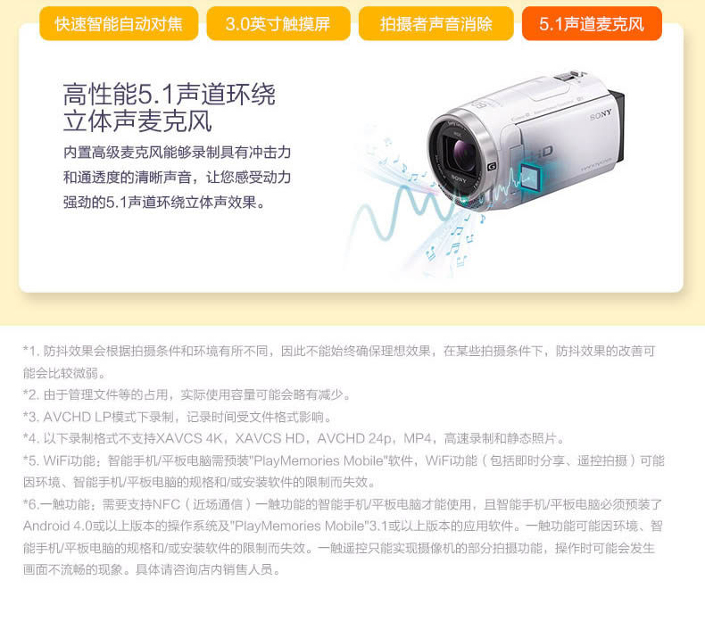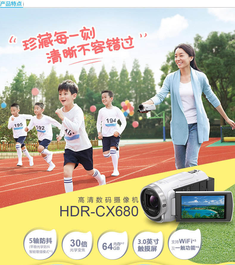 HDR-CX680配备64G 内存,同时搭载了一个支持使用 micro SDXC/SDHC/SD存储卡的卡槽。除了内存上的提升,HDR-CX680对电池也进行了优化,使得续航能力大幅提升,让拍摄更安心。