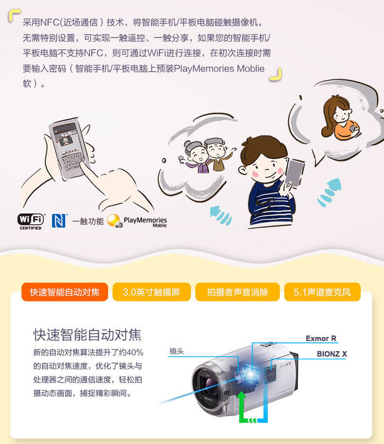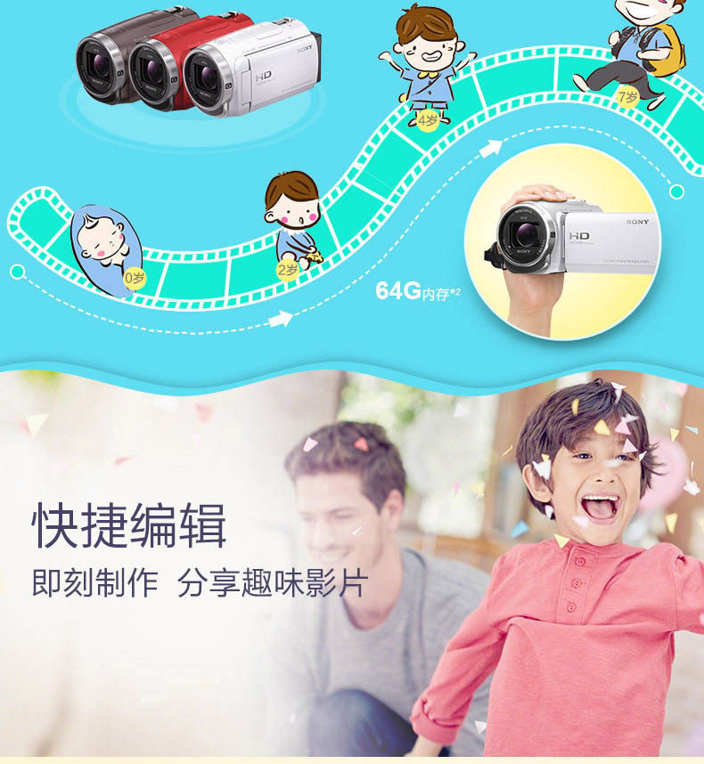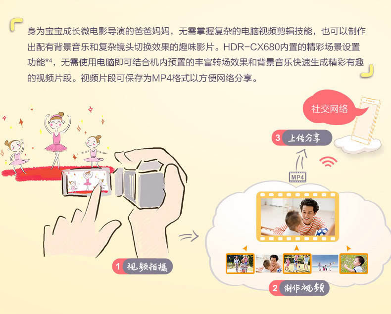 身为宝宝成长微电影导演的爸爸妈妈,无需掌握复杂的电脑视频剪辑技能,也可以制作出配有背景音乐和复杂镜头切换效果的趣味影片。HDR-CX680内置的精彩场景设置功能*,无需使用电脑即可结合机内预置的丰富转场效果和背景音乐快速生成精彩有趣的视频片段。视频片段可保存为MP4格式以方便网络分享。