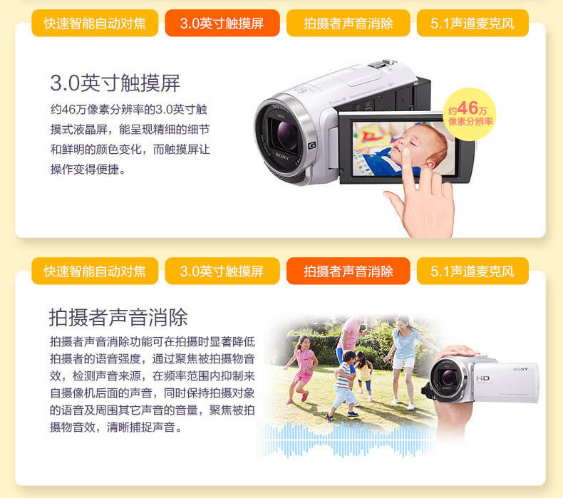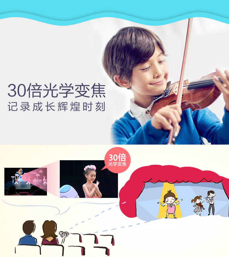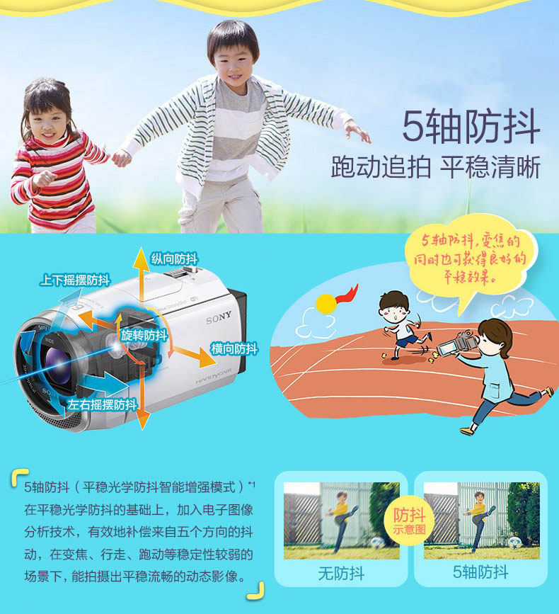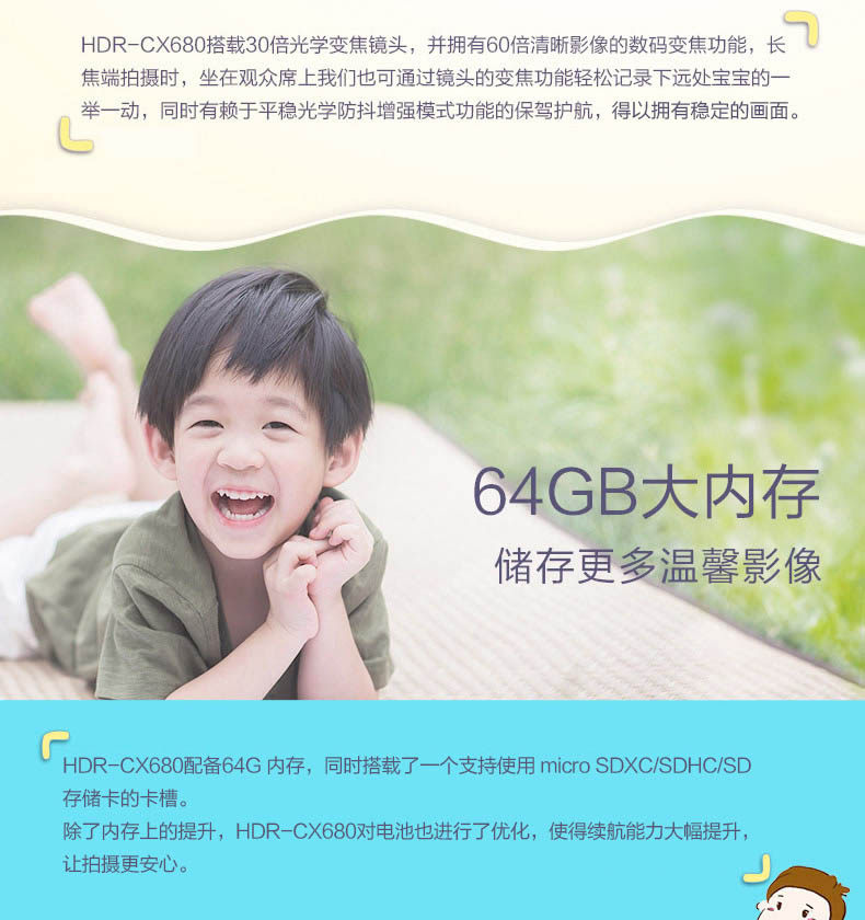 HDR-CX680搭载30倍光学变焦镜头,并拥有60倍清晰影像的数码变焦功能,长焦端拍摄时,坐在观众席上我们也可通过镜头的变焦功能轻松记录下远处宝宝的一举一动,同时有赖于平稳光学防抖增强模式功能的保驾护航,得以拥有稳定的画面。