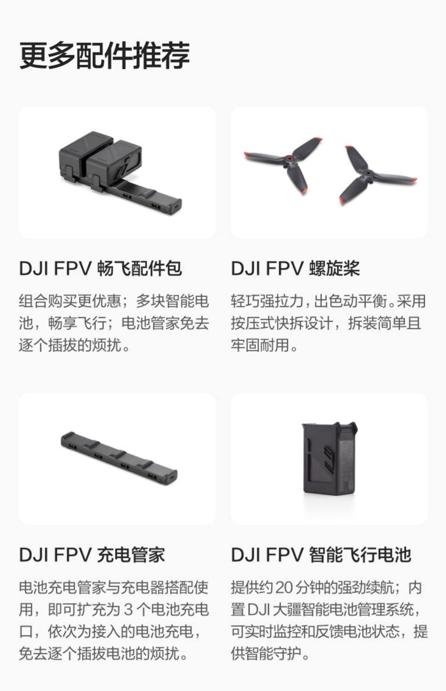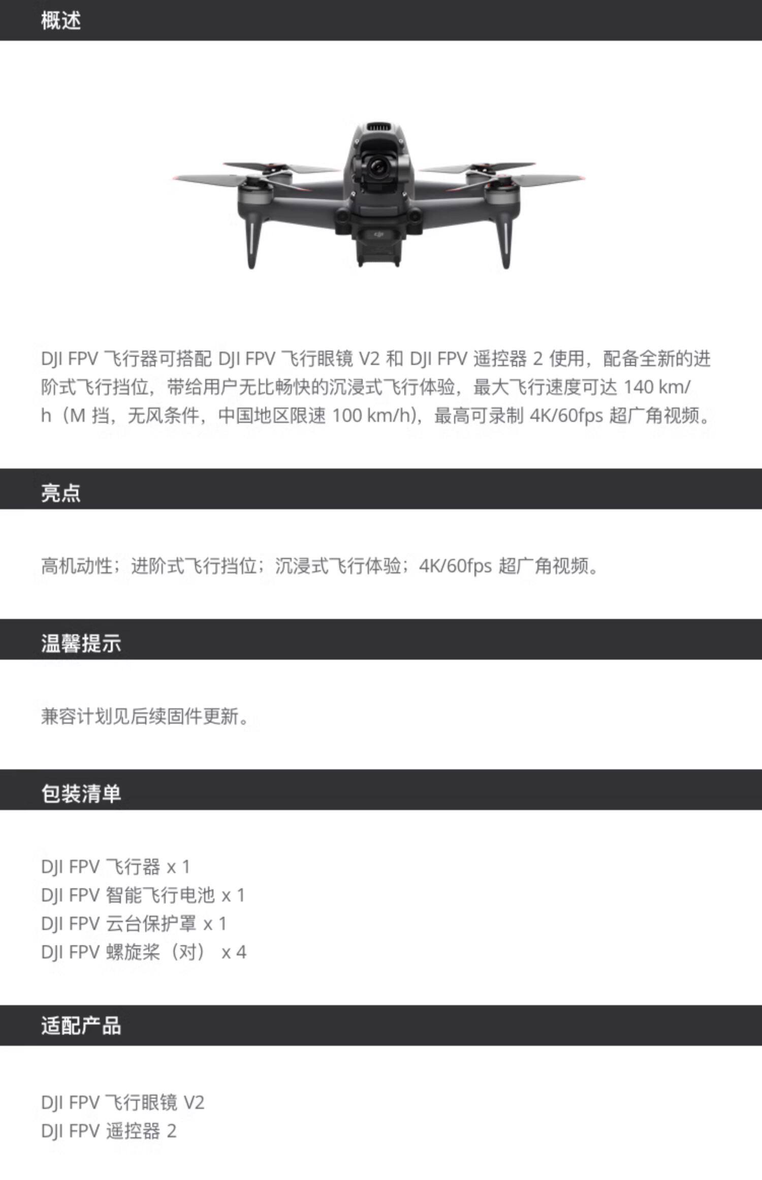 DJI FPV 飞行器可搭配 DJI FPV 飞行眼镜 V2 和 DJI FPV 控器 2 使用
