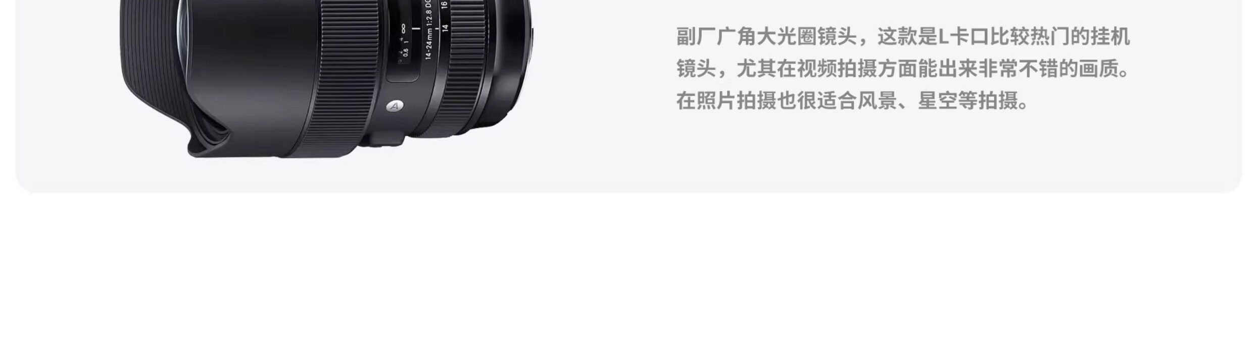 副厂广角大光圈镜头,这款是L卡口比较热门的挂机镜头,尤其在视频拍摄方面能出来非常不错的画质在照片拍摄也很适合风景、星空等拍摄。