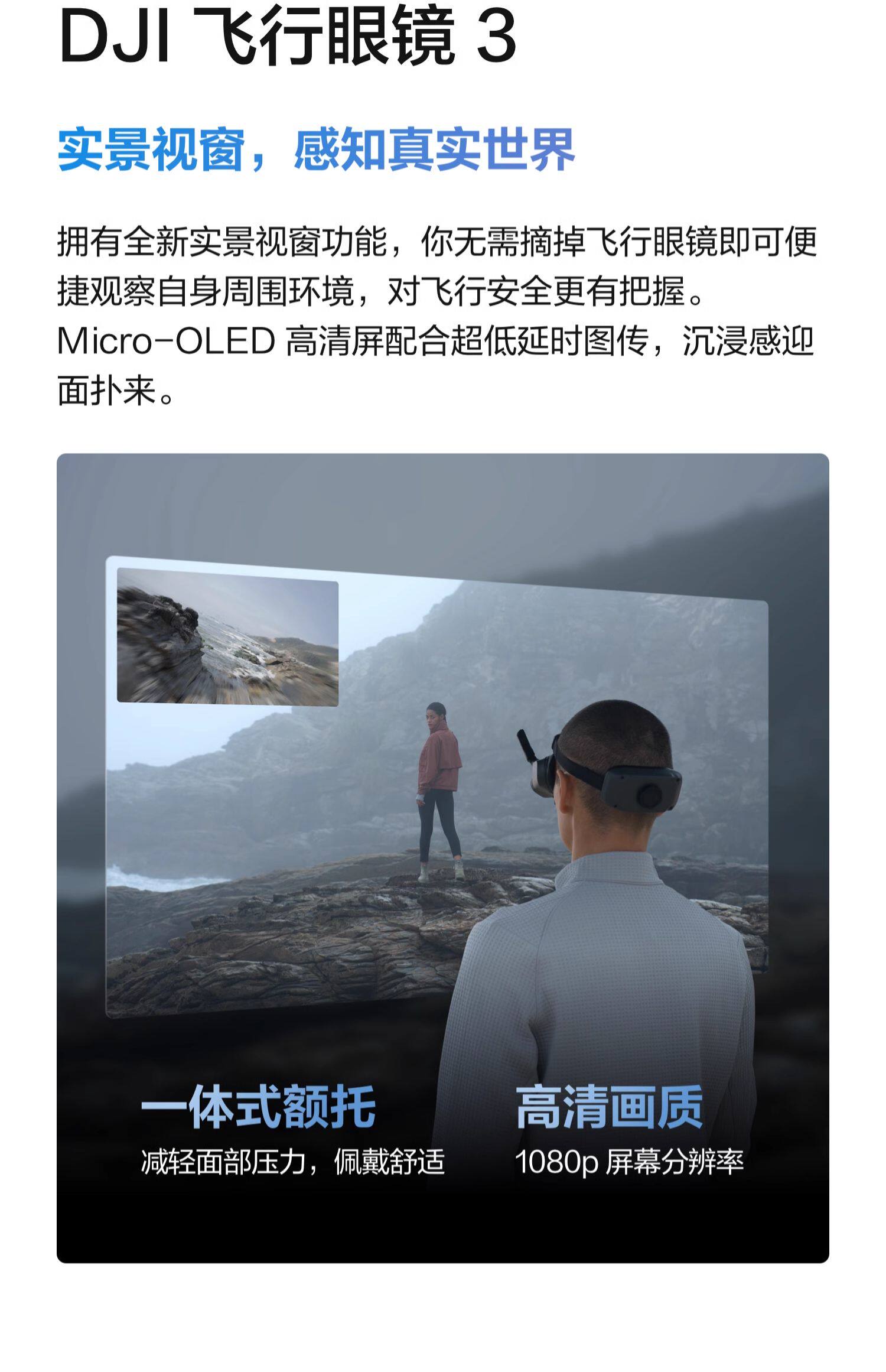 拥有全新实景视窗功能,你无需摘掉飞行眼镜即可便捷观察自身周围环境,对飞行安全更有把握。Micro-OLED 高清屏配合超低延时图传,沉浸感迎面扑来。