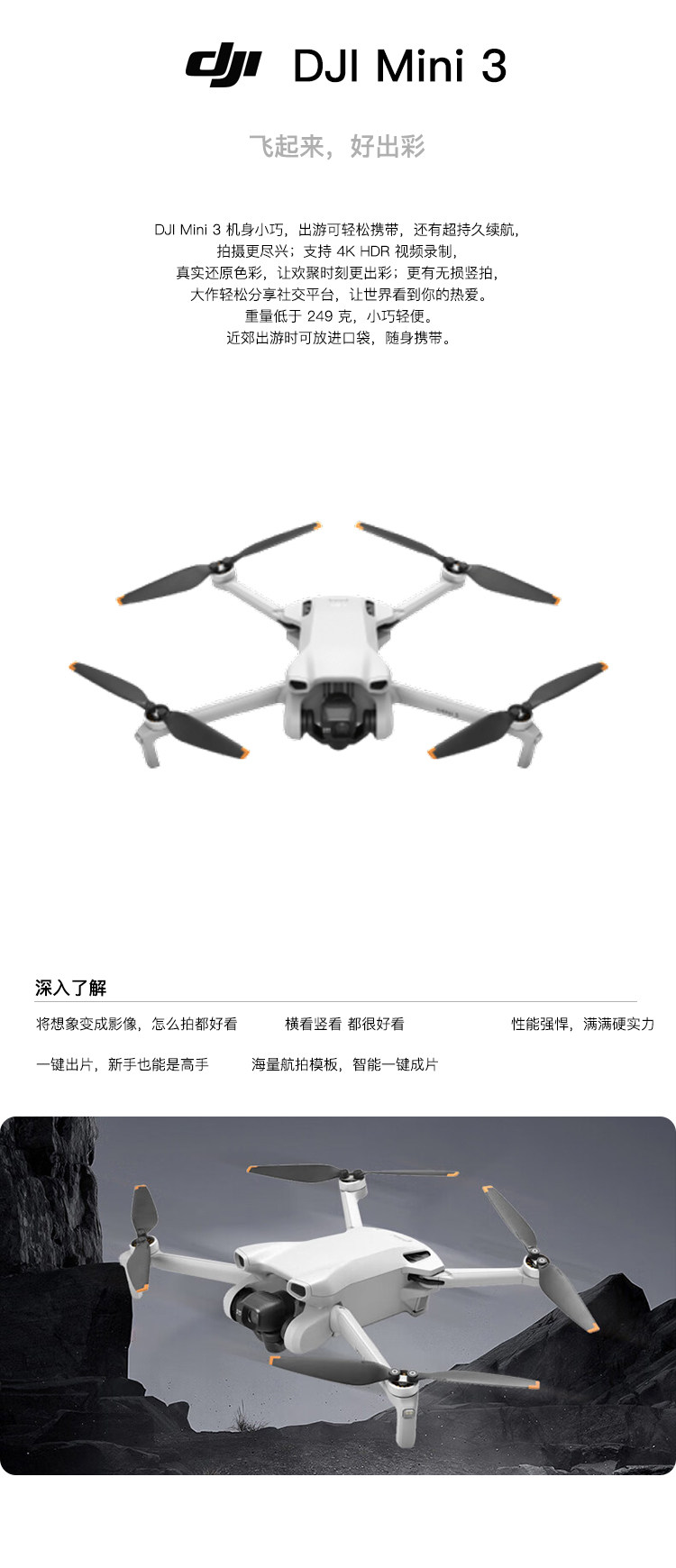 DJI Mini 3 机身小巧,出游可轻松携带,还有超持久续航拍摄更尽兴,支持 4K HDR 视频录制真实还原色彩,让欢聚时刻更出彩