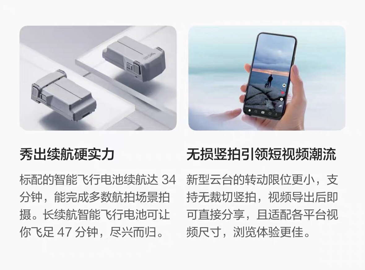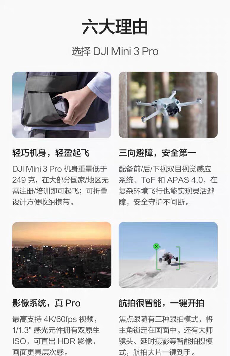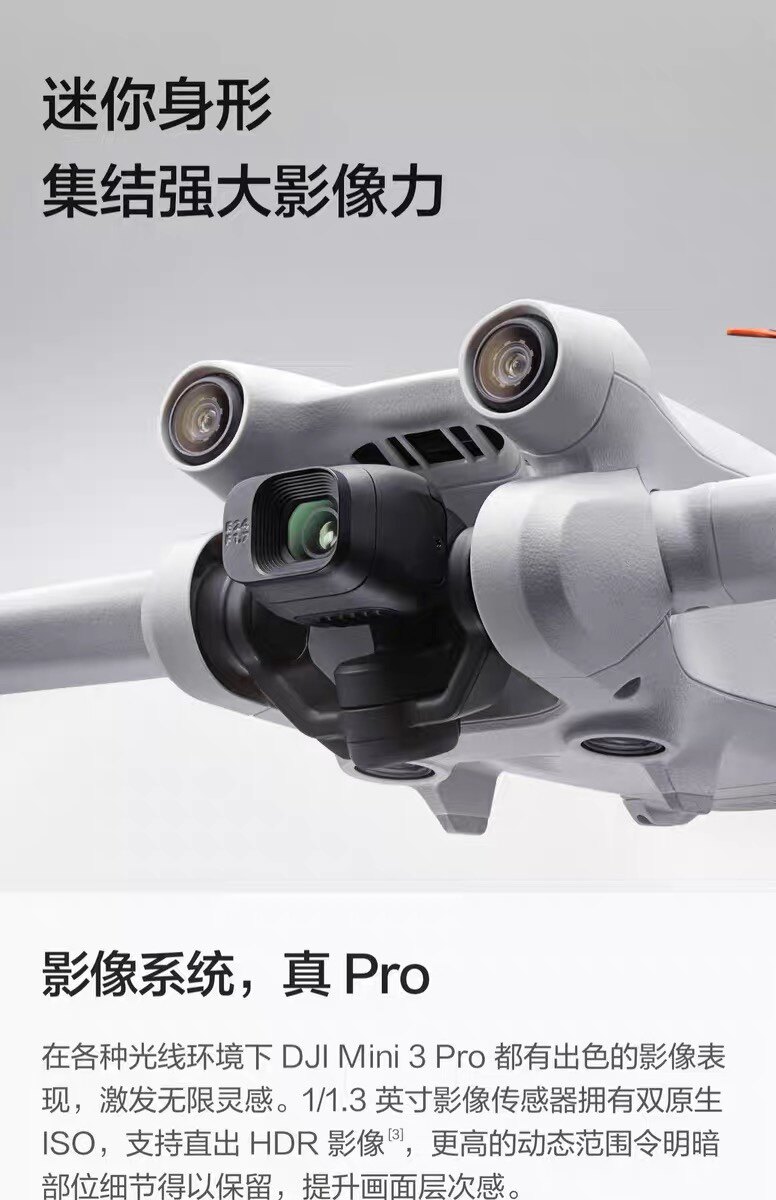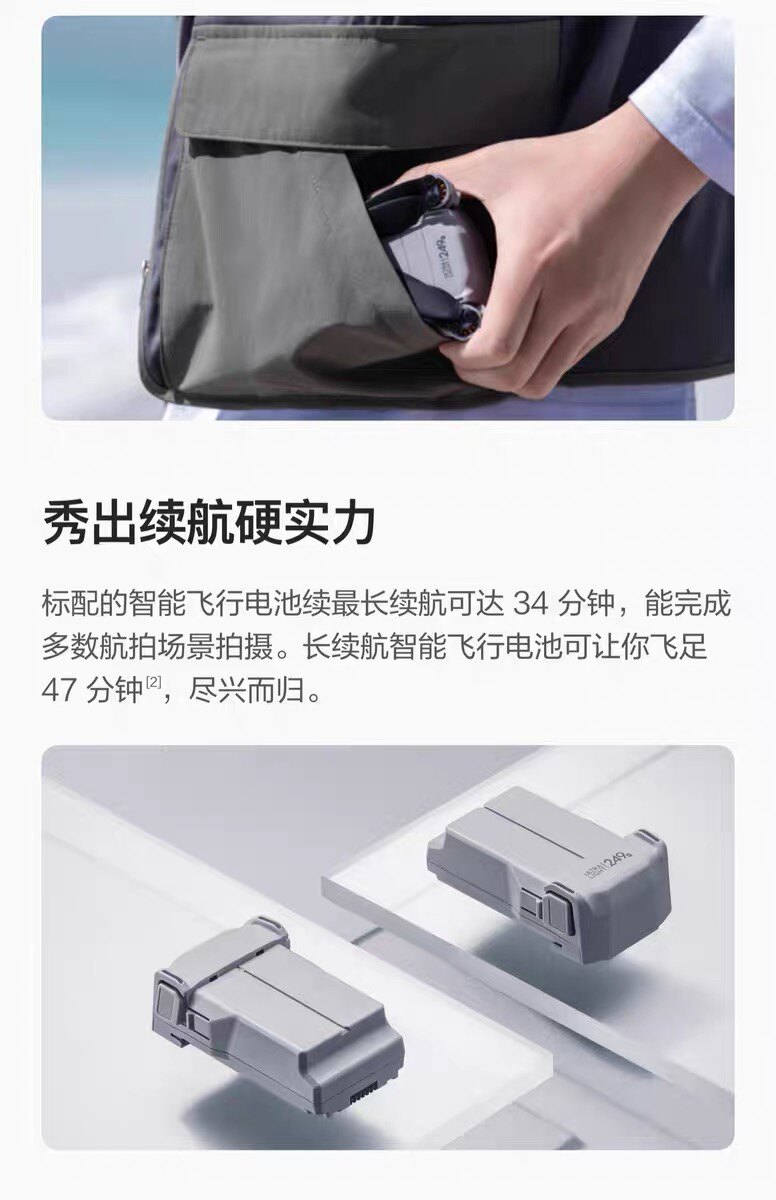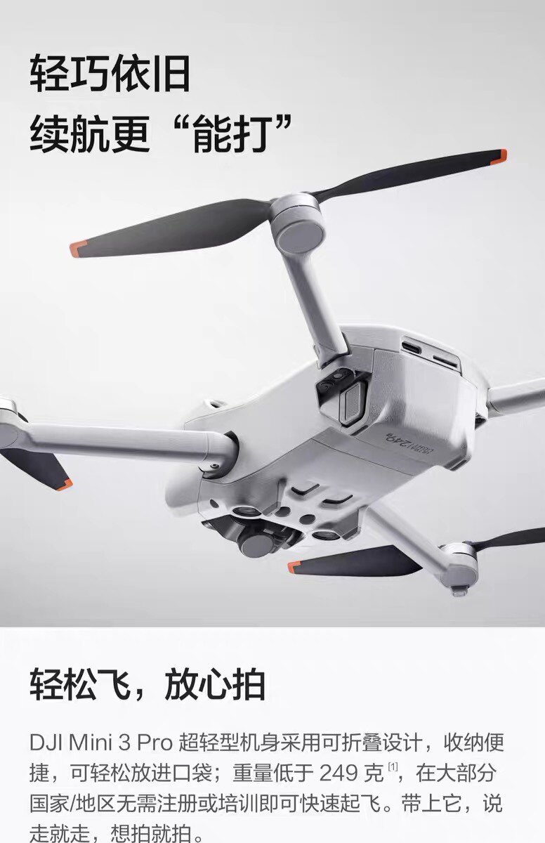 DJI Mini 3 Pro 机身重量低于249 克,在大部分国家/地区无需注册/培训即可起飞,可折叠设计方便收纳携带